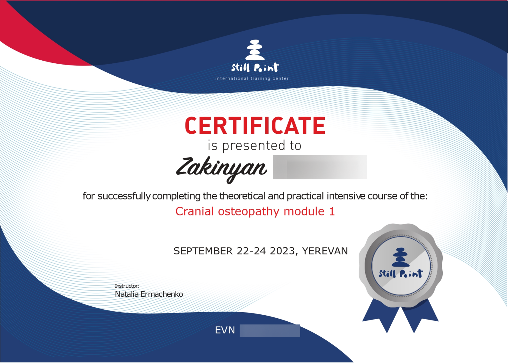На собственные семинары школы остеопатии Still Point мы принимаем всех желающих. Полный курс занимает около 1,5 лет, семинары проходят раз в месяц. Можно приходить на отдельные семинары. По итогам каждого семинара вы получаете сертификат об участии с печатью Still Point и подписью преподавателя, а также методичку, по которой вам будет просто вспомнить пройденное. Пройдя все 12 семинаров, вы получаете итоговый сертификат. Полученные навыки вы можете использовать для себя и родных, можете встроить в свою практику массажиста или кинезиолога.